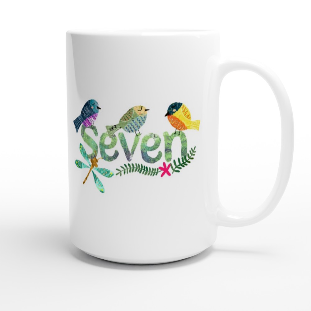 Seven Months Birthday Mug with Colorful Birds and Dragonsfly