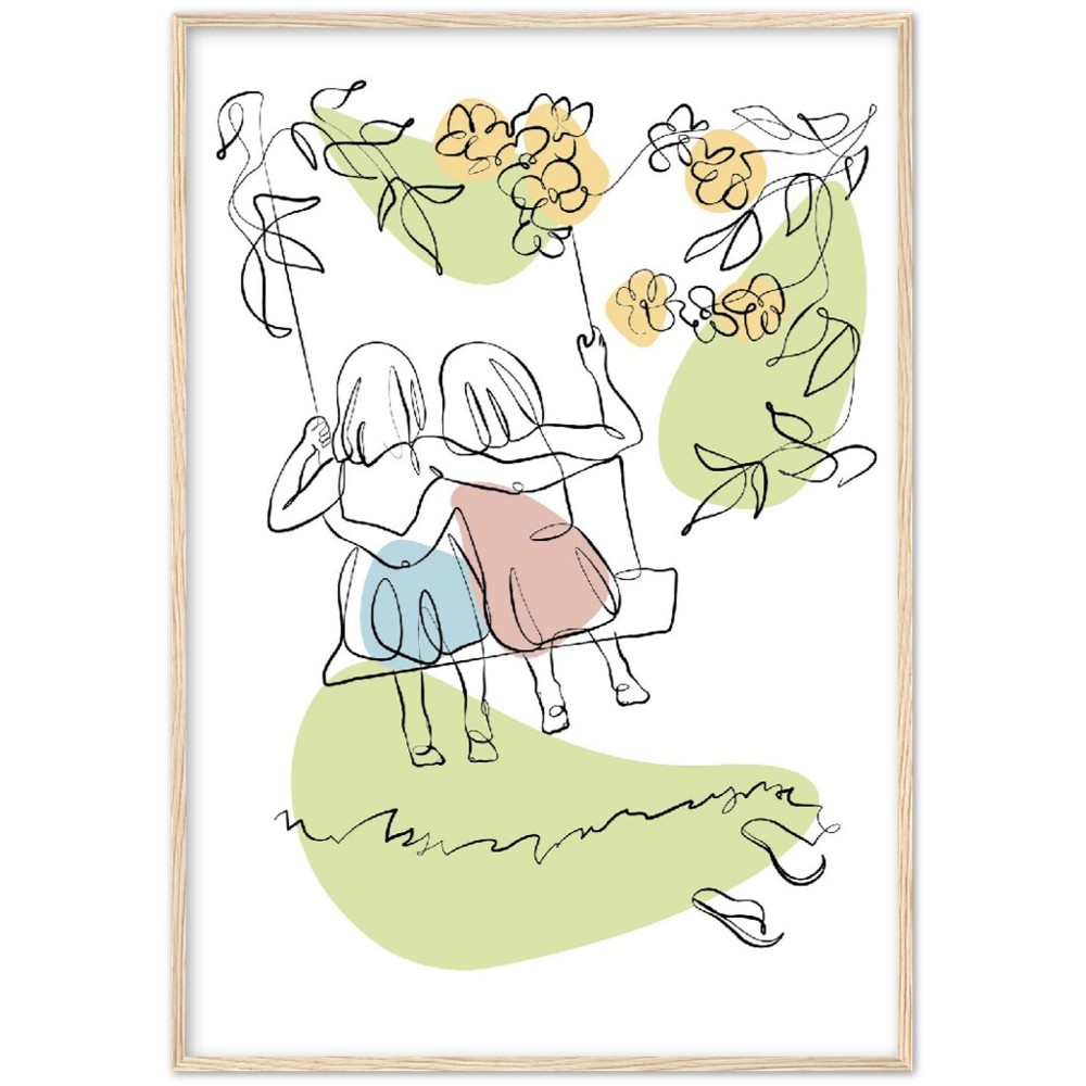 Two Sisters playing Swing, Siblings Wall Art, Nursery Wall decor Line Art Poster